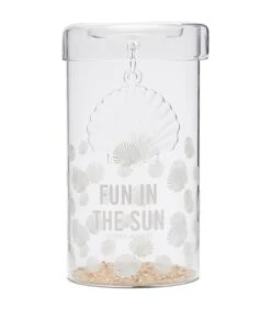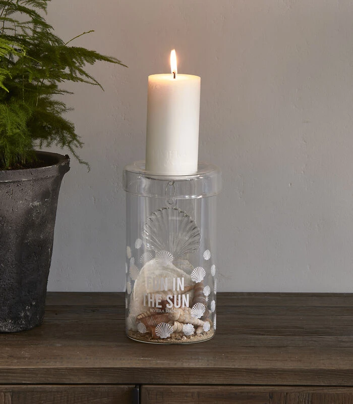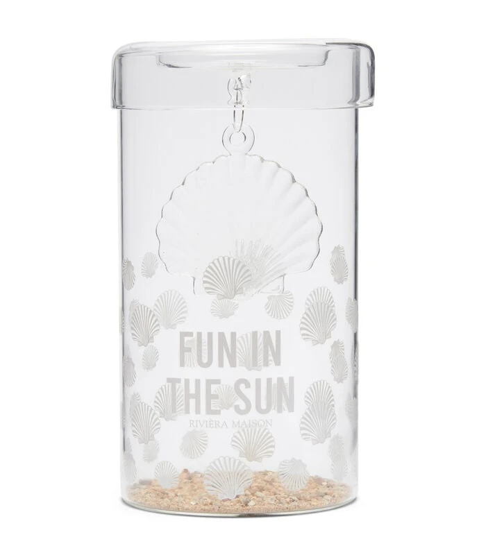 De Fillable Fun in the Sun Hurricane maakt je vrolijk, ook als de zon op zich laat wachten. Het deksel heeft een uitsparing voor een groot theelicht of een kleine stompkaars. Aan het deksel hangt een schelp. De pot is versierd met schelpjes, en geschikt om te vullen met decoratie.