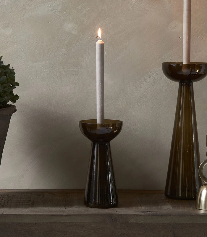 De RM Amber Stone Candle Holder M is amberkleurig glas, naar boven smal toelopend. In de wijde schaal bovenop is een houder voor een tafelkaars aangebracht. Het resultaat mag er zijn, zo kleed je een gedekte tafel of een leuke hoek mooi aan.