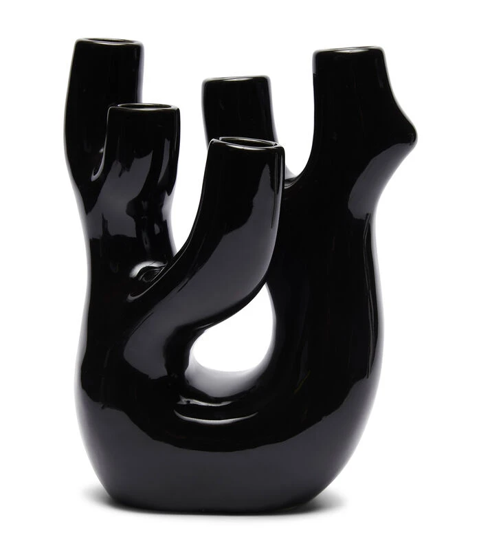 Grillig gevormde kaarsenhouder van zwart porselein, de RM Mnemba Coral Reef Decoration. Geschikt voor zogeheten dinerkaarsen. Liefst vijf stuks passen erin. Feestelijk op een mooi gedekte tafel, maar net zo goed steelt hij de show op een sidetable of op de salontafel. Ook zonder kaarsen heel decoratief.
