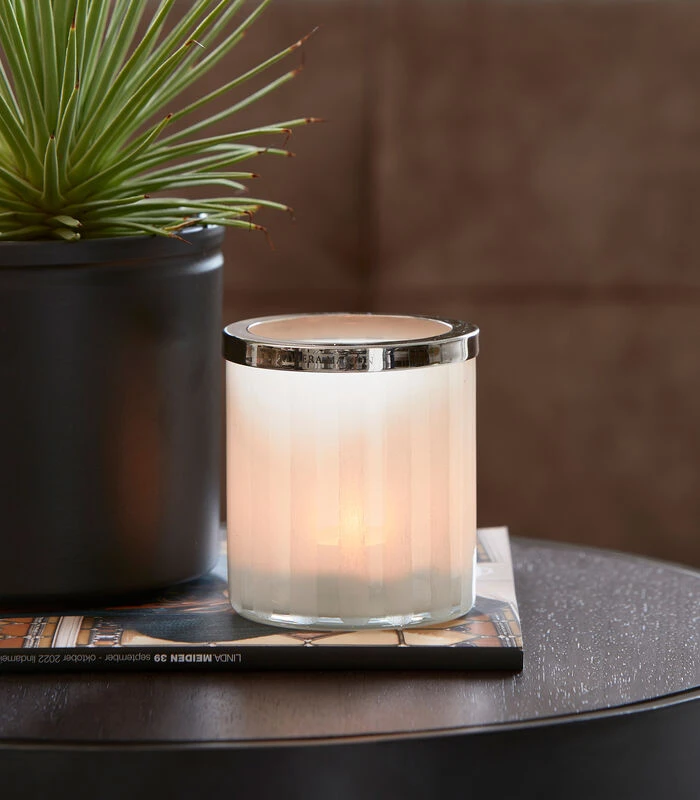 Van theelichthouders kun je er nooit genoeg hebben, daarom hoort de witte RM Santa Monica Votive in je collectie. Met de mond geblazen, en daarna voorzien van verticale strepen, met het effect van matglas. De bovenrand is van zacht glanzend metaal. Dit Riviera Maison artikel is gemaakt van glas, metaal. Het heeft de volgende hoofdkenmerken: Afmetingen: 8,0×8,0x9,5 cm| Gewicht: 0,25 gram | Handgemaakt: Nee | Breekbaar: ja