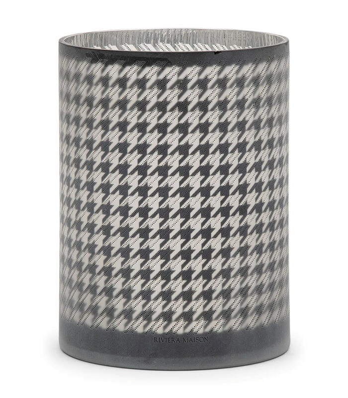 In dit glazen windlicht kan een flinke kaars, want de hoogte is 24 cm en de doorsnede 18 cm. Dat betekent vele uren plezier van het subtiele licht dat wordt bereikt door het pied–de–poule–patroon. Daarvoor waren vijf lagen print over elkaar heen nodig. Een geduldig werkje!